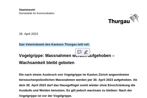 Vogelgrippe: Massnahmen werden aufgehoben